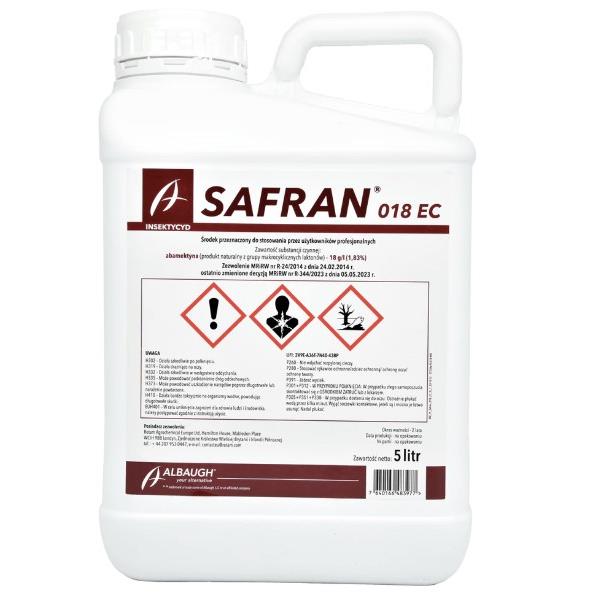 OPIS DZIAŁANIA Safran 18 EC jest środkiem owadobójczym i przędziorkobójczym w formie koncentratu do sporządzania emulsji wodnej o działaniu kontaktowym i żołądkowym, przeznaczonym do zwalczania owadów szkodliwych w uprawie gruszy, truskawki, maliny, jeżyny, oberżyny, ogórka, papryki, pomidora, chryzantemy i róży. Środek przeznaczony do stosowania przy użyciu opryskiwaczy sadowniczych i ręcznych. Etykieta środka ochrony roślin Safran 18 EC, załącznik do decyzji MRiRW 1 Załącznik do decyzji MRiRW nr R - 158/2015d z dnia 06.03.2015 r. zmieniającej zezwolenie MRiRW nr R - 24/2014 z dnia 24.02.2014 r. STOSOWANIE ŚRODKA ROŚLINY SADOWNICZE Grusza Miodówka gruszowa plamista Maksymalna /zalecana dawka dla jednorazowego zastosowania: 0,75 l/ha. Środek można stosować łącznie z adiuwantem Superam 10 AL (50 ml/100 l cieczy użytkowej). Termin stosowania: środek stosować po okresie kwitnienia drzew i zauważeniu pierwszych objawów uszkodzeń. Zalecana ilość wody: 500-1000 l/ha. Zalecane opryskiwanie: drobnokropliste. Maksymalna liczba zabiegów w sezonie wegetacyjnym: 1. ROŚLINY WARZYWNE UPRAWIANE POD OSŁONAMI Oberżyna, ogórek, papryka, pomidor Przędziorek chmielowiec Maksymalna / zalecana dawka dla jednorazowego zastosowania: 0,05% (50 ml środka w 100 litrach wody). Zalecana ilość cieczy użytkowej: 500-1500 l/ha (w zależności od wielkości i zagęszczenia roślin na plantacji). Zalecane opryskiwanie: drobnokropliste. Maksymalna liczba zabiegów w sezonie wegetacyjnym: 2. Odstęp między zabiegami: co najmniej 7 dni. ROŚLINY OZDOBNE UPRAWIANE POD OSŁONAMI Chryzantema, róża Przędziorek chmielowiec Maksymalna / zalecana dawka dla jednorazowego zastosowania: 0,05% (50 ml środka w 100 litrach wody). Termin stosowania: Opryskiwać rośliny po zauważeniu szkodnika lub pierwszych objawów uszkodzeń. Zalecana ilość cieczy użytkowej: 500-2000 l/ha (w zależności od wielkości i zagęszczenia roślin na plantacji) Zalecane opryskiwanie: drobnokropliste. Liczba zabiegów: 2. Odstęp między zabiegami: co najmniej 7 dni. Maksymalna liczba zabiegów w sezonie wegetacyjnym w uprawie róży: 2 Chryzantema Wciornastek zachodni Maksymalna / zalecana dawka dla jednorazowego zastosowania: 0,05% (50 ml środka w 100 litrach wody). Termin stosowania: Opryskiwać rośliny po zauważeniu szkodnika lub pierwszych objawów uszkodzeń. Zalecana ilość cieczy użytkowej: 500-2000 l/ha (w zależności od wielkości i zagęszczenia roślin na plantacji) Etykieta środka ochrony roślin Safran 18 EC, załącznik do decyzji MRiRW 2 Załącznik do decyzji MRiRW nr R - 158/2015d z dnia 06.03.2015 r. zmieniającej zezwolenie MRiRW nr R - 24/2014 z dnia 24.02.2014 r. Zalecane opryskiwanie: drobnokropliste. Liczba zabiegów: 2 Odstęp między zabiegami: co najmniej 7 dni. Maksymalna liczba zabiegów w sezonie wegetacyjnym w uprawie chryzantemy: 2. Gerbera Miniarki Maksymalna / zalecana dawka dla jednorazowego zastosowania: 0,05% (50 ml środka w 100 litrach wody). Termin stosowania: Opryskiwać rośliny po zauważeniu szkodnika lub pierwszych objawów uszkodzeń. Zalecana ilość cieczy użytkowej: 500-2000 l/ha (w zależności od wielkości i zagęszczenia roślin na plantacji) Zalecane opryskiwanie: drobnokropliste. Maksymalna liczba zabiegów w sezonie wegetacyjnym: 2. Odstęp między zabiegami: co najmniej 7 dni. Stosowanie środka ochrony roślin w uprawach i zastosowaniach małoobszarowych Odpowiedzialność za skuteczność działania i fitotoksyczność środka ochrony roślin stosowanego w uprawach małoobszarowych ponosi wyłącznie jego użytkownik. Truskawka uprawiana w gruncie i pod osłonami Przędziorek chmielowiec Maksymalna / zalecana dawka dla jednorazowego zastosowania: 1,2 l/ha. Termin stosowania: Opryskiwać rośliny po zauważeniu szkodnika lub pierwszych objawów uszkodzeń przed kwitnieniem (BBCH 00-49) lub po zakończeniu kwitnienia (BBCH 71-99). Zalecana ilość wody: 500 - 1200 l/ha. Zalecane opryskiwanie: drobnokropliste. Maksymalna liczba zabiegów w sezonie wegetacyjnym: 1. Malina, jeżyna Przędziorek chmielowiec Maksymalna / zalecana dawka dla jednorazowego zastosowania: 0,5 l/ha. Termin stosowania: Opryskiwać rośliny po zauważeniu szkodnika lub pierwszych objawów uszkodzeń (BBCH 00-99). Zalecana ilość wody: 1000 - 1200 l/ha. Zalecane opryskiwanie: drobnokropliste. Maksymalna liczba zabiegów w sezonie wegetacyjnym: 2. Odstęp pomiędzy zabiegami: co najmniej 28 dni. Etykieta środka ochrony roślin Safran 18 EC, załącznik do decyzji MRiRW 3 Załącznik do decyzji MRiRW nr R - 158/2015d z dnia 06.03.2015 r. zmieniającej zezwolenie MRiRW nr R - 24/2014 z dnia 24.02.2014 r. ŚRODKI OSTROŻNOŚCI I ZALECENIA STOSOWANIA ZWIĄZANE Z DOBRĄ PRAKTYKĄ ROLNICZĄ 1. Środek Safran 18 EC stosować przemiennie ze środkami o odmiennym mechanizmie działania. 2. Opryskiwać całe rośliny – zwracając uwagę na dokładne pokrycie cieczą użytkową również dolnej strony liści. 3. Środka Safran 18 EC nie stosować przed spodziewanym deszczem. 4. Przed zastosowaniem środka na rośliny ozdobne i dyniowe na każdej uprawianej po raz pierwszy odmianie wykonać próbny zabieg celem sprawdzenia, czy w ciągu 7 dni nie wystąpiły objawy uszkodzenia roślin. SPORZĄDZANIE CIECZY UŻYTKOWEJ Przed przystąpieniem do sporządzania cieczy użytkowej dokładnie ustalić potrzebną jej ilość. Odmierzoną ilość środka wlać do zbiornika opryskiwacza napełnionego częściowo wodą, z włączonym mieszadłem. Opróżnione opakowania przepłukać trzykrotnie wodą, a popłuczyny wlać do zbiornika opryskiwacza z cieczą użytkową, uzupełnić wodą do potrzebnej ilości i dokładnie wymieszać. Następnie zbiornik opryskiwacza uzupełnić wodą do potrzebnej ilości. Po wlaniu środka do zbiornika opryskiwacza nie wyposażonego w mieszadło hydrauliczne ciecz w zbiorniku mechanicznie wymieszać. W przypadku przerw w opryskiwaniu przed ponownym przys